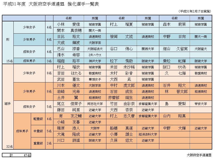 平成31年度 大阪府空手道連盟 強化選手一覧 大阪府連事務局2019年2月25日2019年3月13日 おしらせ 平成31年度 大阪府空手道連盟 強化選手一覧表 画像をクリックすると拡大されます ← 第23回大阪武道祭2/11 全空連会員登録新方法の説明会 →