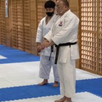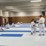 午後からの講師は(公財)全日本空手道連盟七段、(公財)全日本空手道三級資格審査員、大阪府空手道連盟技術委員会指導部会員 礒田正典先生でした。参加者6名、部会員5名でした。礒田先生は形を練習するときの呼吸方法や、いかに力を抜くか、松濤館流の指定形第一、第二でポイントを説明されながら細かく指導されました。また熟練された燕飛をみんなの前で示範されました。