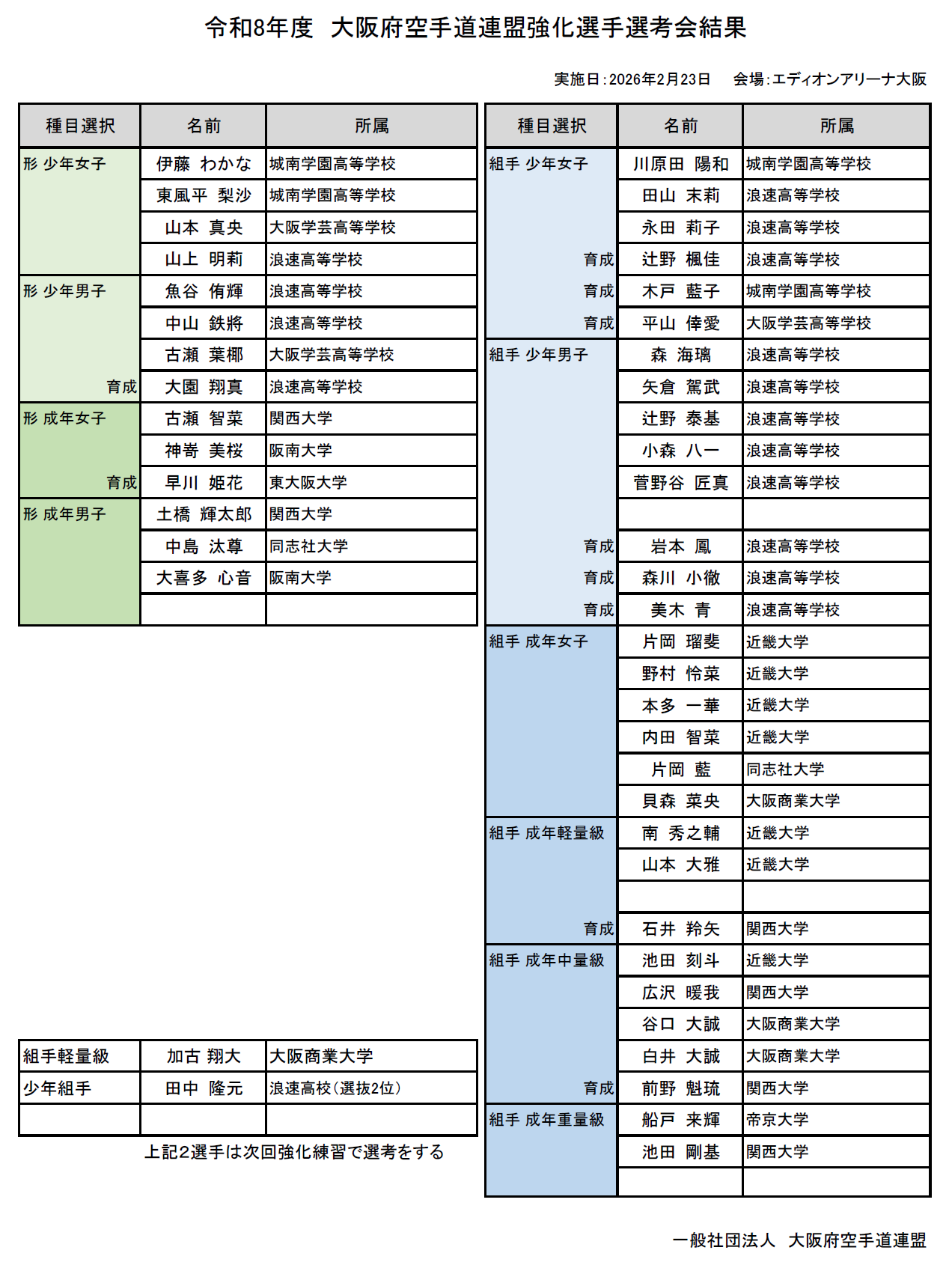 令和8年度(一社)大阪府空手道連盟強化選手決定のお知らせ